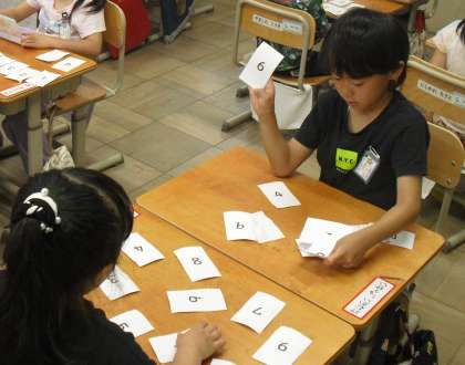 今日の算数は数字カードを使って学習しました。10を「2と8」、「4と6」のように分ける学習です。友だちが出した数字カードに合わせて、10になる数字のカードを探すゲームをしました。10の分け方はとっても大事。何回も繰り返して覚えていこう!
