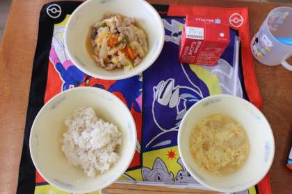 今日は「豚肉とキャベツのソース炒め」「トマトと卵のスープ」でした。