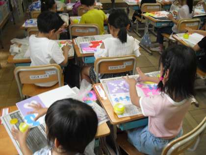 今日の図画工作では、折り紙で作った飾りを使って作品を作りました。折り紙は重ねて切ると、手をつないだ人や色んな模様の飾りが作れました。でんぷんのりも使って、好きなところにぺたぺた。今日も楽しく作品作りができました。