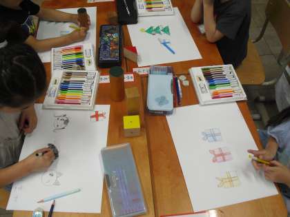 1年生は算数で形の勉強をしています。今日は積み木を鉛筆でうつして円や四角形、三角形など、色んな形を作りました。そこから想像を膨らませて、「三角はクリスマスツリーに見える!」「四角はお手紙にしよう。」と色んな絵に変身させていました。