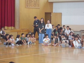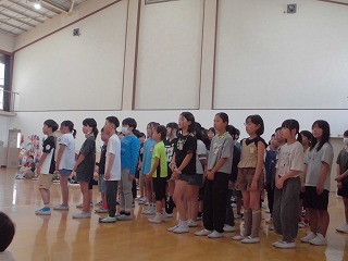 新しく川岡東小学校の仲間となった1年生の入学のお祝いとして、5年生からは川岡東小学校の児童会ソング「明日をつくろう」についてクイズと歌で紹介しました。