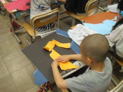 図画工作では画用紙を破いてみて、できた形から作品を作りました。画用紙を破ると、「お山に見えてきた!」「魚に見える。」など、色んなつぶやきが聞こえてきました。破った画用紙を貼ったり、重ねたり、クレパスで塗ってみたり。みんなのイメージが広がって、楽しい作品になりました。