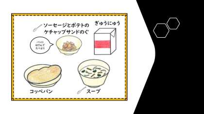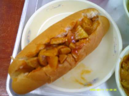 今日の給食は、新献立、「ソーセージとポテトのケチャップサンド」です。