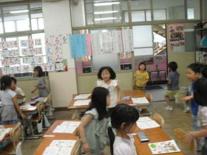 1年生は色んな曲ではくをとる学習をしています。特に大好きな歌は「じゃんけんぽん」です。歩き回って、友だちとじゃんけんをしながら、リズムを感じます。「ぐーちょきぱー」は「たんたんたん!」カスタネットも使いながら、楽しみました。