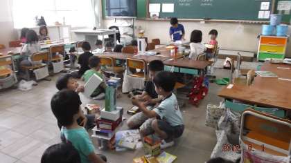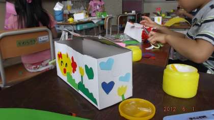 図工では「にょきにょきとびだせ」の単元で箱を飾りました。日曜参観では,この箱から何を飛び出させるか・・・自分で考えたものをビニール袋にかきます。
