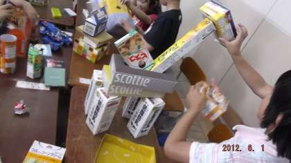 算数は「いろいろなかたち」の単元。家から持ってきたいろいろな形の箱を組み合わせて,好きな動物や乗り物などを自由に作りました。