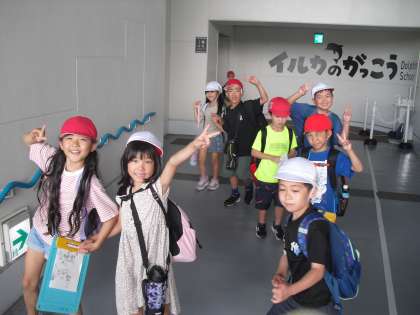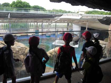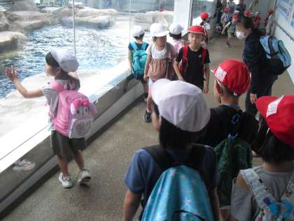 水族館ははぐれないように、1・2年生がグループになって見学しました。1年生は頼りになる2年生に手をつないでもらってうれしそうでした。話を聞くと、「クラゲがきれいだった。」「アザラシがかわいかった。」など、お気に入りの場所が見つかったようです。