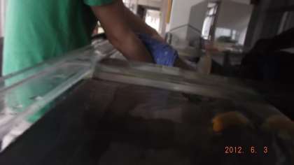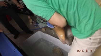 アロワナを水槽に入れるところです。