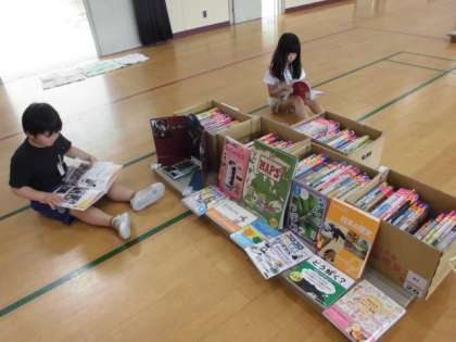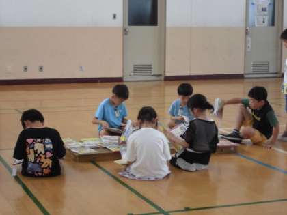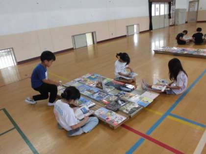 体育館にずらりと並んだ本に興味津々な子どもたち。