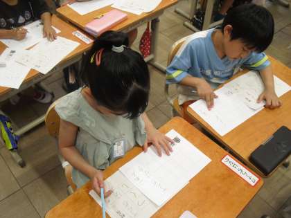 1年生はひらがなもほとんど覚えたので、硬筆の作品展に出す字を書きました。今回は消しゴムが使えないと聞いて、子どもたちはドキドキ。一筆一筆緊張しながら、丁寧に書いていました。