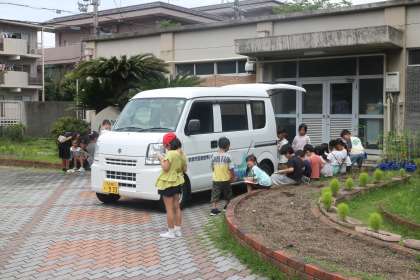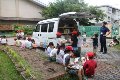 また、中間休みは中庭に移動図書館が来て、子どもたちは楽しそうに本を読んでしました。