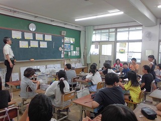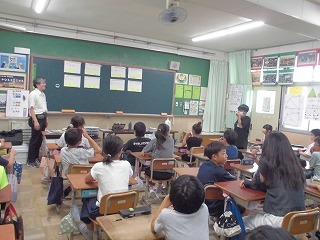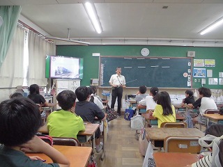 総合的な学習の時間に阪急電鉄の方にゲストティーチャーとして来校していただき、阪急電車の線路をつくる仕事や線路を繋げる計画を立てる仕事、そして電車が開通したことによって増えた仕事などについてお話していただきました。