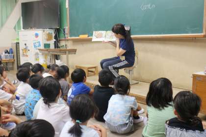 毎週、低学年に読み聞かせをしてくれるには、読み聞かせサークルのおひさまです。