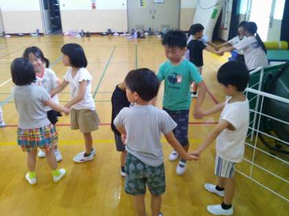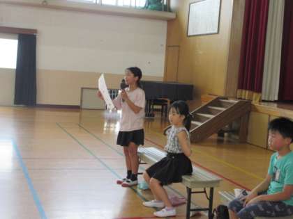 「なかよし学級と1年生のなかよくなろう会」をしました。なかよし学級の子ども達が自己紹介クイズをした後、人数集めゲームやじゃんけん列車をしました。暑い中でしたが、みんな大盛り上がりでした。