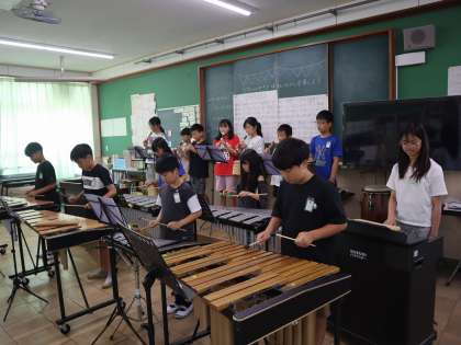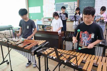 音楽科の学習では、2グループに分かれて合奏の発表を見せ合いっこしました。