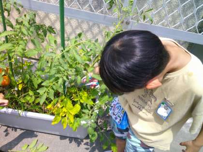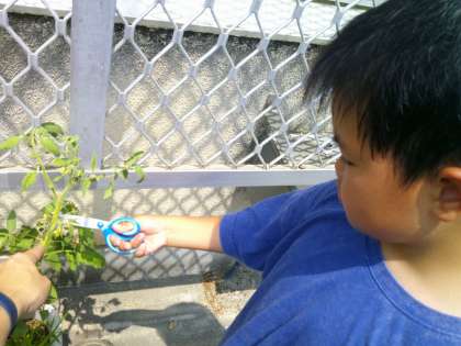 なかよしで育てているトマトのわき芽を摘みました。