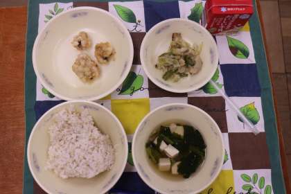 今日は「はものこはく揚げ」「ピーマンのごまいため」「すまし汁」でした。