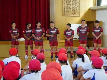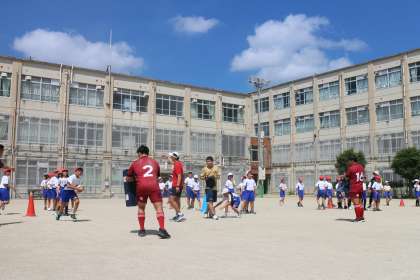 島津製作所のラグビーチームが来校されて、子どもたちにラグビーの楽しさを教えていただきました。