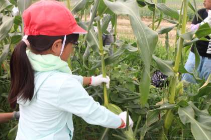 自分たちの背丈よりも伸びた茎から、太ったとうもろこしを選びました。