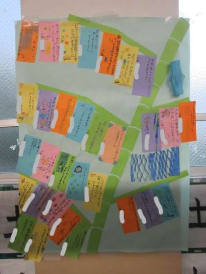 7月7日は七夕でした。みんなで七夕飾りを作って、笹飾りに飾りました。みんなの願いが届くといいなあ。