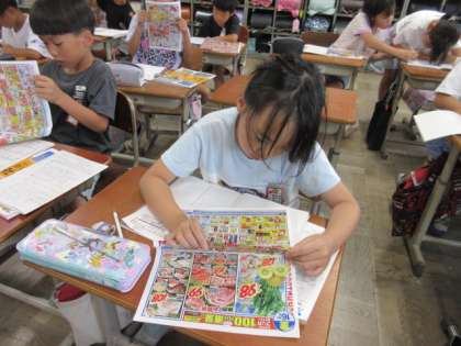 社会科で、スーパーの商品がどこから届いているのか、ちらしを使って調べました。じゃがいもは北海道から、牛肉は鹿児島県から、など、日本各地から届いているものもあれば、ニュージーランドや中国から届いているものもあり、調べてみていろいろな発見がありました。お家の人とスーパーに買い物に行ったときに、ぜひ産地にも目を向けてみてほしいと思います。