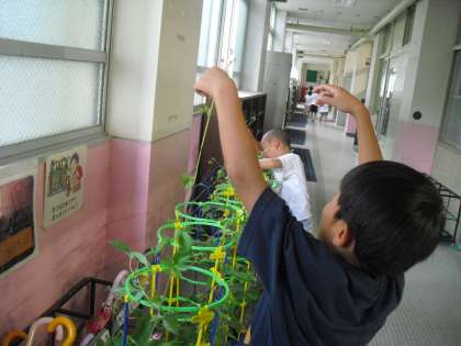 夏休みに向けて続々とアサガオを持ち帰っています。立派に育ったアサガオはつるがぐんぐん伸びました。時には隣のアサガオに絡まってしまうことも・・・ほどきながら「りっばに育ったね。」とみんなで話していました。