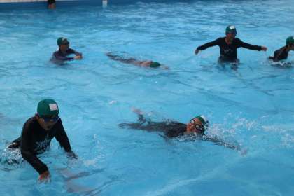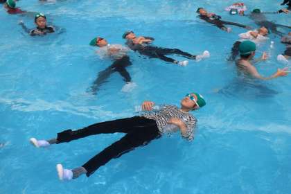 もしも、服を着た状態で海や川に入ることになったとき、どのようにするのかを教わりながら、実践しました。