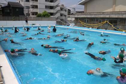 服を着て泳ぐことの大変さや、身近にあるものを使って浮くことができるかなど体験しました。