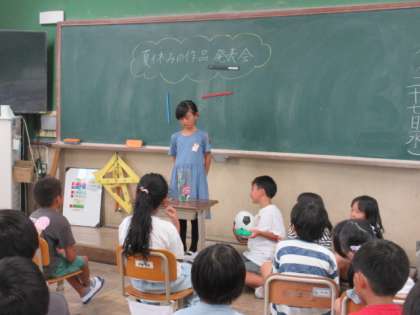夏休みの宿題で取り組んだ作品や自由研究の発表会をしました。工夫したところやみんなに見てほしいところ、自由研究をして分かったことなど、一人一人前に出て生き生きと伝えてくれました。保護者の皆様にも、9月9日(火)の参観日にお越しの際に、ぜひ見ていただけたらと思います。、