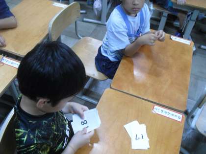 算数では、11〜20までの数も登場しました。今日は数字カードを使って、大きさ比べをしました。数が大きくなってもへっちゃらな1年生たち。カードの数が3枚、4枚に増やしても比べられる人もいました。