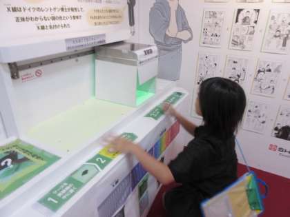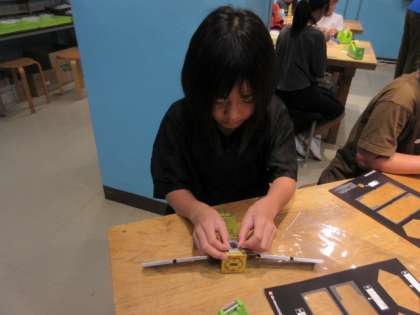 モノづくりでは、「ひさき型分光器」を作りました。中をのぞくと、光の種類によって中の虹の色が変わります。係の人の説明を聞きながら一生懸命に作り、教室に帰って、なかよし学級のみんなにも話しました。