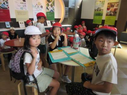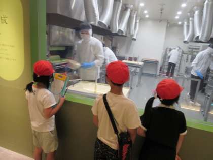 9月3日に3年生の社会見学があり、なかよし学級の3年生も参加しました。「おたべ本館」では、「京ばあむ」と「おたべ」の材料などについて教えていただいた後、製造工程の見学をしました。バームクーヘンを焼いている様子や抹茶ソースをかける様子、機械で包装されていく様子などを目の前で見ることができ、子ども達は大喜びでした。
