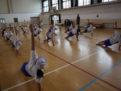 体育科のマット運動の終わりに、運動会の組体操に向けて、すこ〜し練習を始めました。