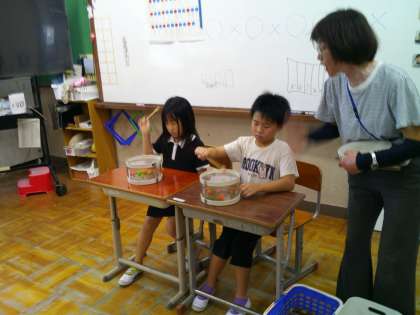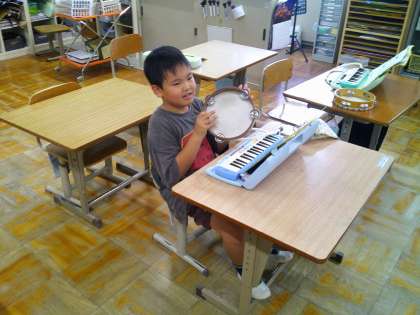 音楽の時間にリズム打ちをしました。小さい太鼓やタンブリンを使って、強弱をつけて打ったり、「タン・ウン・タン・ウン・タン・タン・タン・ウン」と、休符の入ったリズムを打ったりしました。一人では難しい子どもも、友だちと一緒に頑張りました。