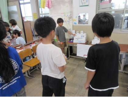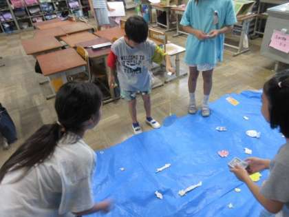 今日は、3年生のお祭りに招待してもらいました。魚釣りやボーリング、くじ引きに射的などなど、楽しいゲームがいっぱいで、子ども達はとても楽しそうでした。中には、折り紙で作った景品をプレゼントしてもらえるゲームもあり、みんな大喜び。教室に帰ってからも、見せ合ったり遊んだりしていました。