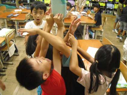 国語ではあおむしが主人公の「やくそく」という物語の学習をしています。今回も音読劇をしながら体を動かして、「せのび」や「目を丸くする。」など、言葉の意味を学んでいます。写真は班のみんなで「大きな木」になっている様子です。今回もどんな劇になるのか楽しみです。