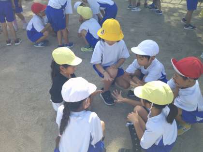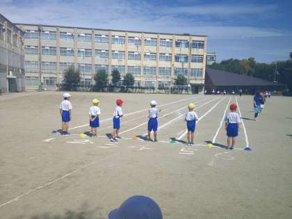 1年生も運動会に向けての練習がいよいよスタートしました。赤色、白色、黄色の組に分かれて、50mを走る練習です。どのコースを走るかは、同じレースの人と相談して決めました。練習も力いっぱい走りました。