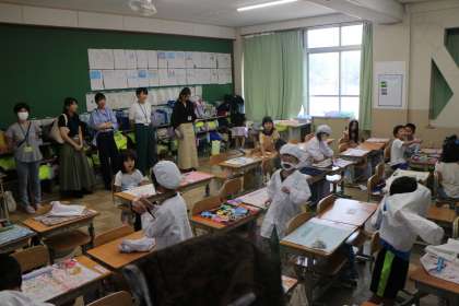 栄養教諭から学校給食の話を聞いた後は、給食の作る様子を見学し、子どもたちの配膳の様子を参観しました。