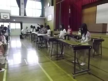 本日,児童朝会でメロディー委員会の児童が演奏しました。まだまだ練習不足なところもありますが,精一杯演奏しました。演奏に合わせて全校で児童会の歌を歌いました。次の時もよろしくお願いしますね。