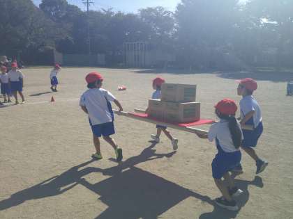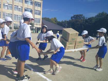 合同練習が始まると、「せーの!」と元気な掛け声が聞こえてきました。上にのせられた箱が落ちないように、みんなで息を合わせます。「落とさなかった!」「上手に運べた!」と喜ぶ声が1年生からも2年生からも聞こえてきました。次は更に速く運べるように、みんなでがんばっていきましょう。