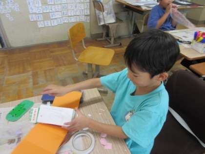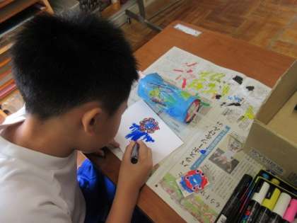 先日、袋を膨らますのが楽しすぎてなかなかおもちゃ作りにたどり着けなかったのですが、今日は、箱や袋を飾ったり、絵を描いたりすることができました。画用紙を切って貼る子、マジックで直接絵を描く子、描いた絵を貼る子など、おもいおもいの作品が仕上がってきました。