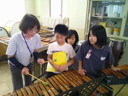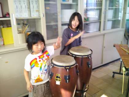 普段、教室ではできない木琴や様々な打楽器を叩いて音楽を楽しみました。