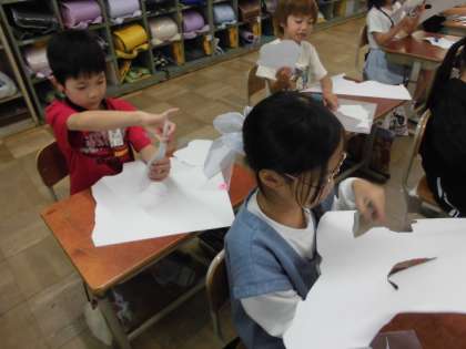 白の画用紙を思いのままに切って、切ったものを並べ、何に見えるかをじっくりと考えました。