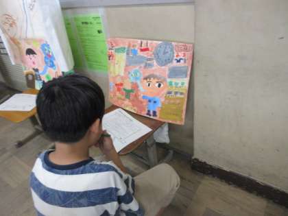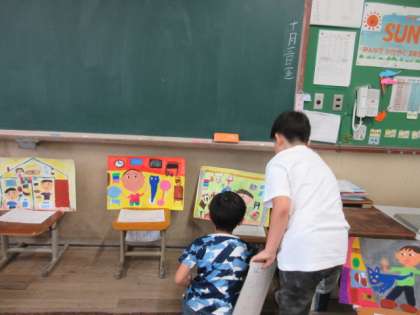 図画工作科で取り組んだお話の絵が完成しました。思い思いの構図や色遣いを工夫して、とても素敵な作品ができました。鑑賞会では、一人一人が工夫したところを書いた紹介カードを見ながら、表現の良さを感じ取っていました。