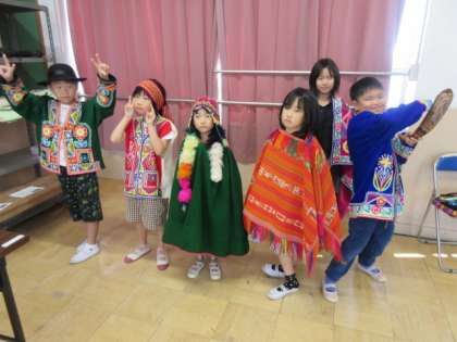 今月の「思いやりの日」のテーマは、国際理解教育です。今年度は、アンデス地方の場所や暮らしについて教室で学習した後、衣装や楽器、食べ物、道具などの展示を見ました。子ども達は、きれいな衣装や楽器に興味津々。衣装を着たり、楽器に触れたりして、アンデスの文化に親しみました。
