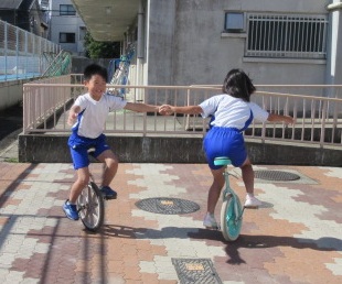 昨年度の途中から、一輪車に乗りたいと練習を始めた子ども達。始めは、手すりにつかまって進むのがやっとで、乗れる日は来るのだろうかと心配になるくらいでした。ですが、暑い日も寒い日も、こけて痛い思いをしてもあきらめずに練習していて、今年度になり、急に乗れるようになってきました。そしてついに、2人で、メリーゴーランドができるまでに上達しました!すごい!よく頑張ったね。今は、柱などがない所で乗り始められる「空中乗り」を練習しているようです。