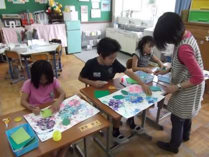 図工の時間にアジサイの花の切り絵をしました。模様をつけた下絵の画用紙に,花びらや葉っぱを切り取ってはりつけていきます。 −完成間近−