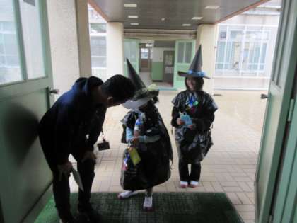 「いたずらされたら困る〜」「いたずらしないで〜」と、教職員の皆さんが、たくさんお菓子をくれました。廊下で出会った先生の中には、お菓子を持っていなくて、お化けたちにこちょこちょこちょ〜と、いたずらされた先生もいました。