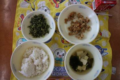 今日は「とりそぼろ丼」「大根葉とじゃこのいためもの」「すまし汁」でした。