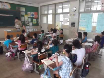 「かくれた数はいくつ」の学習をしています。数図ブロックを使ったり,線分図を書いたりして考えています。みんな自分の考えをしっかり発表しています。ノートもわかりやすく丁寧に書いています。